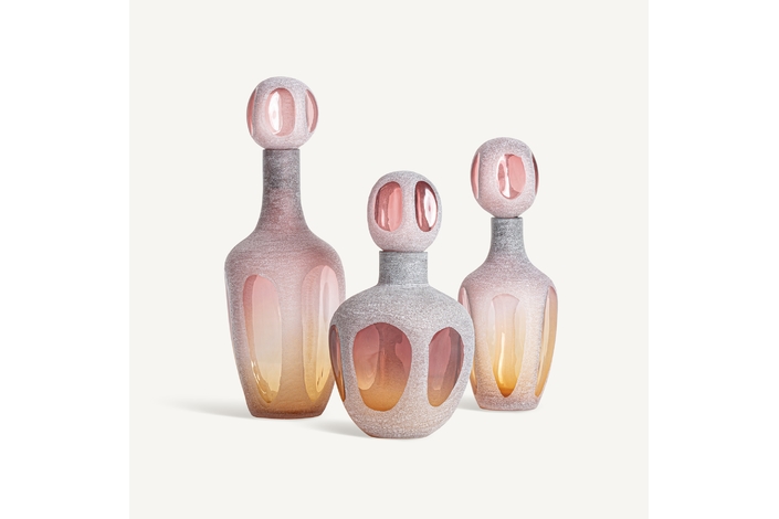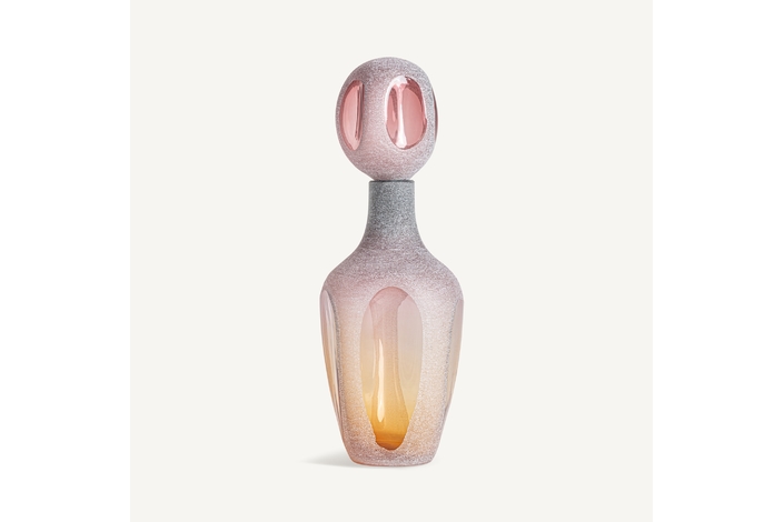 Jarrón, fabricado en vidrio en color rosa en color ambar.