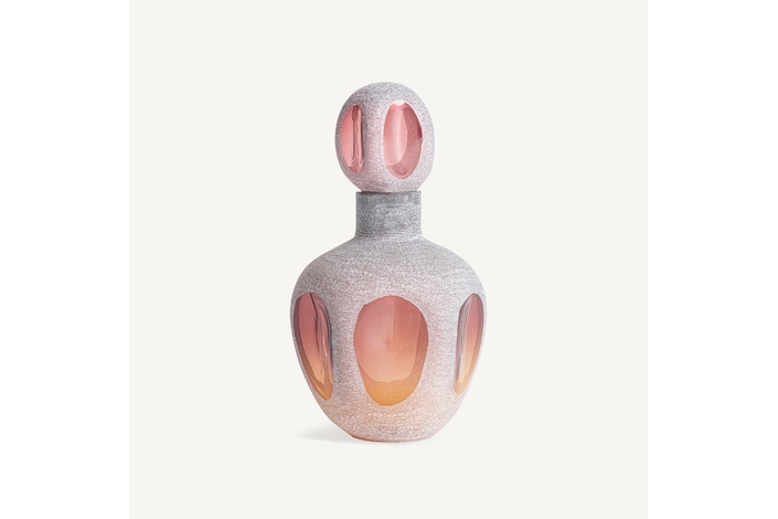 Jarrón, fabricado en vidrio en color rosa en color ambar.