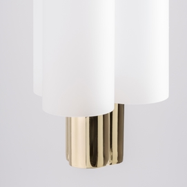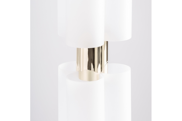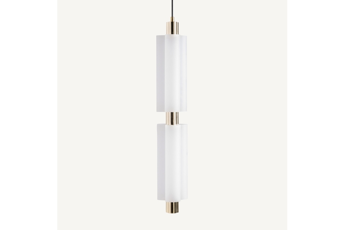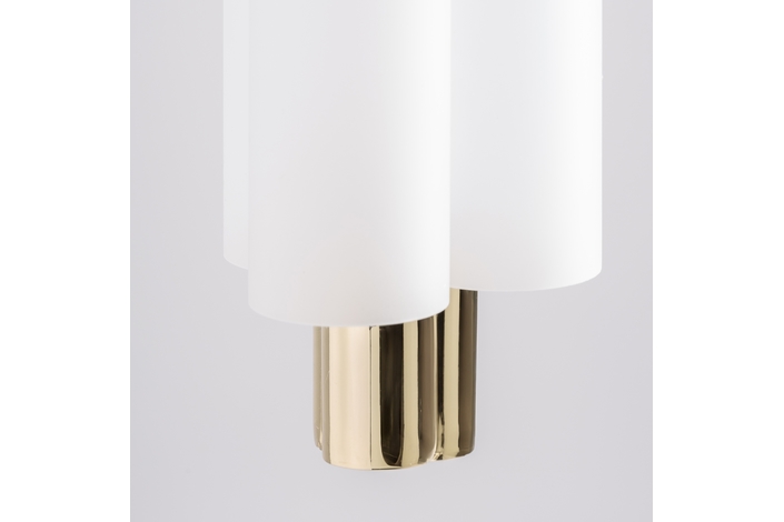 Lámpara de colgar, fabricado en cristal en color blanco, combinado con acero en color dorado.