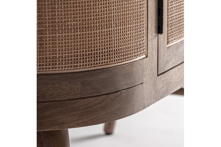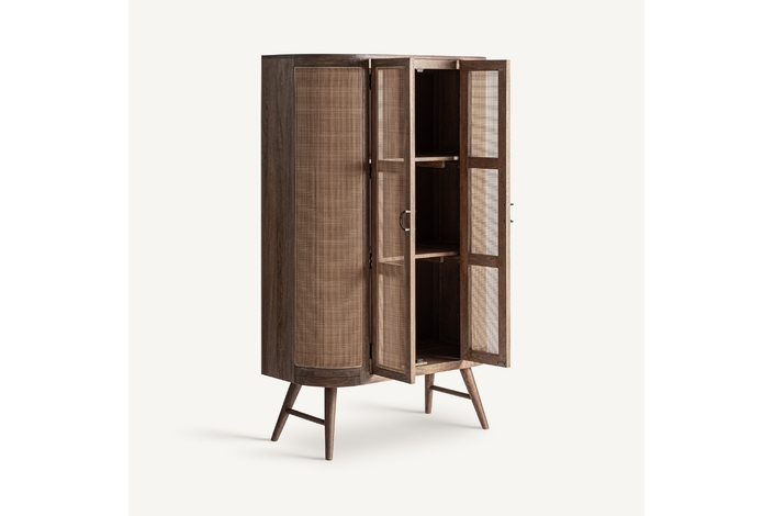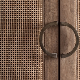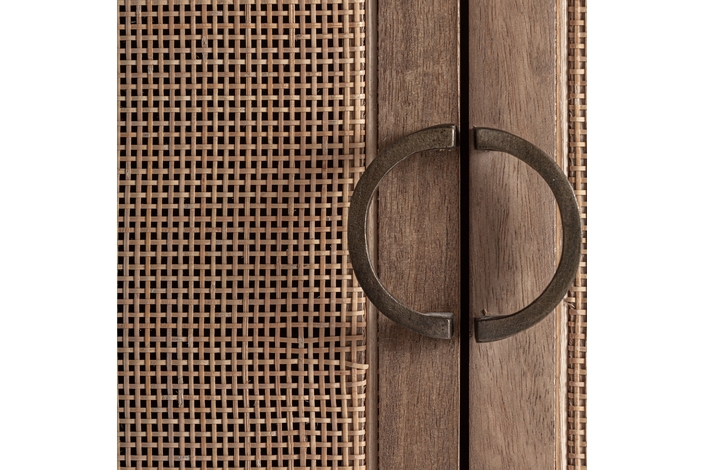 Armario Beckley de estilo nórdico, fabricado en madera de mango en color marrón, combinado con mimbre en color marrón claro. Producto desmontable.