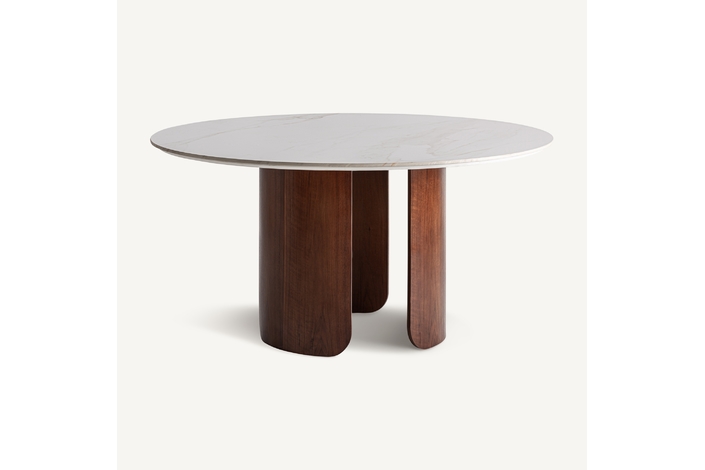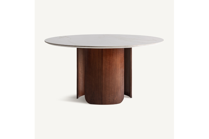 Mesa comedor, fabricado en porcelánico en color blanco, combinado con madera contrachapada en color marrón.