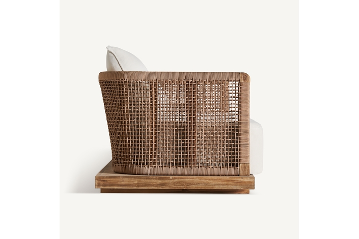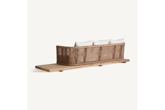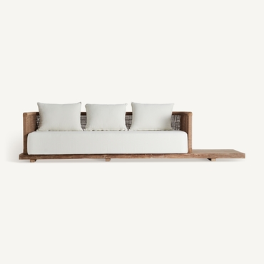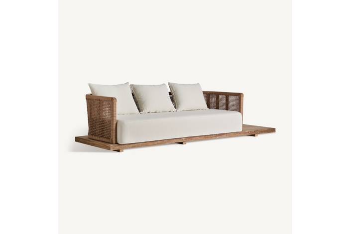 El sofá Trena transforma cualquier espacio exterior en un oasis. Su estructura en teca reciclada y su tapizado en polipropileno reciclado blanco lo convierten en una pieza desenfundable, desmontable y cargada de armonía. Una mezcla impecable entre estética natural y confort contemporáneo.