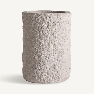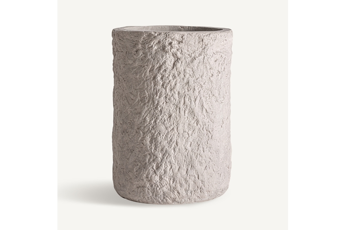 Macetero, fabricado en cemento en color topo, combinado con fibra de vidrio.