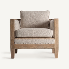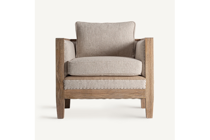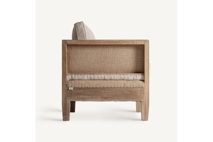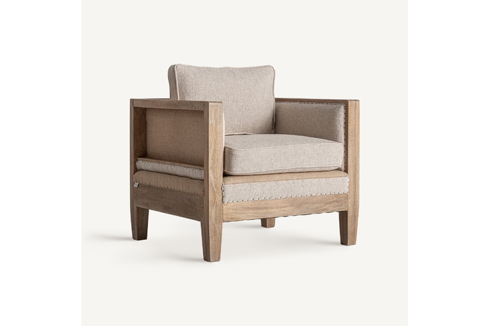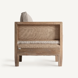 Sillón, fabricado en madera abedul en color marrón, combinado con lino en color beige y yute.