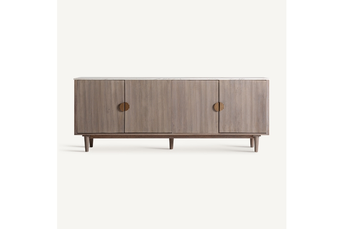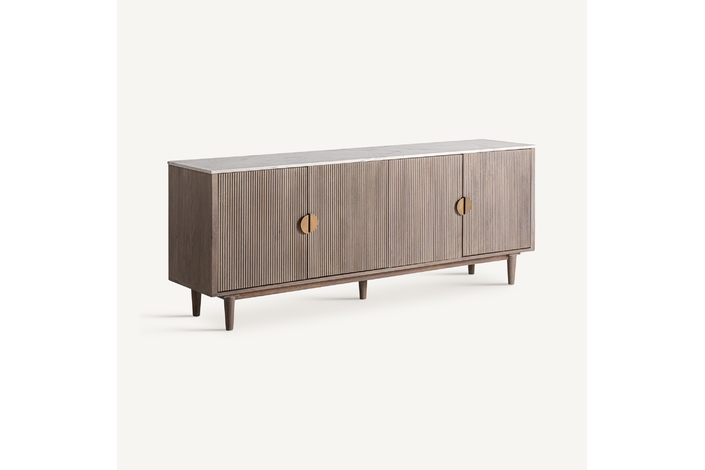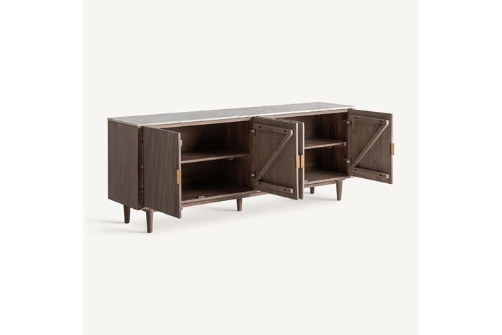 Aparador Zerf de estilo contemporáneo, fabricado en madera de mango en color marrón, combinado con mármol en color blanco y madera dm en color marrón.