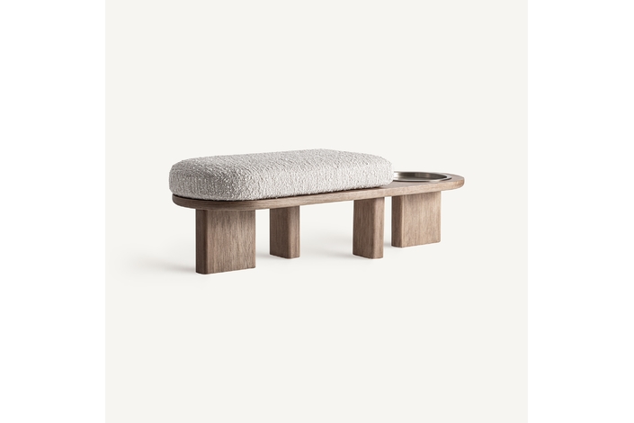 Pie de cama, fabricado en poliéster, combinado con acero inoxidable en color dorado y madera dm en color marrón.