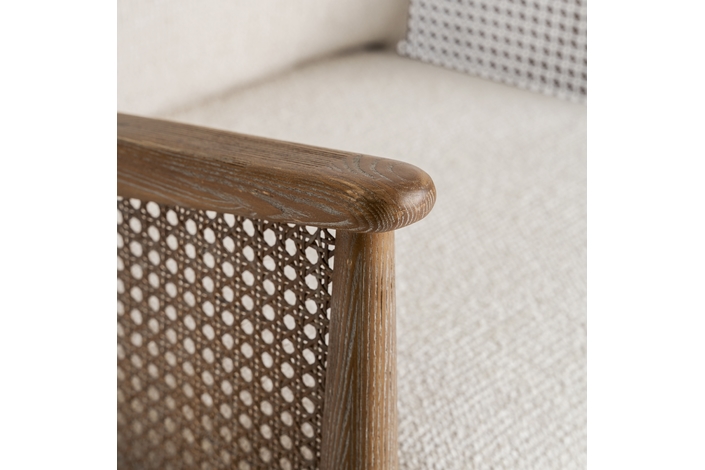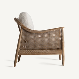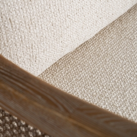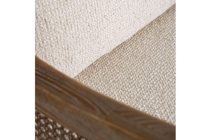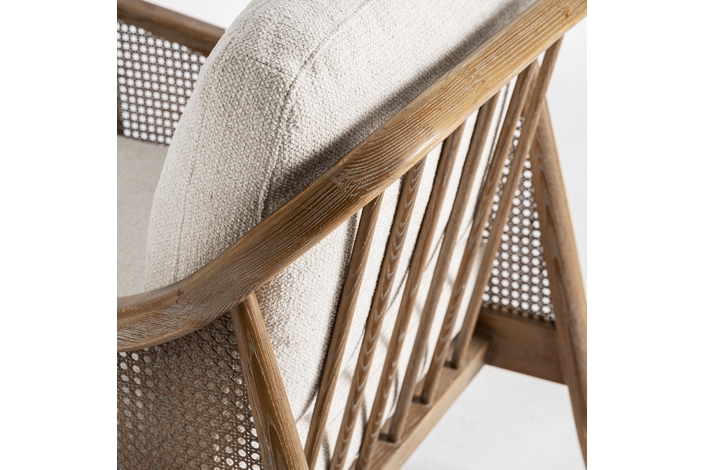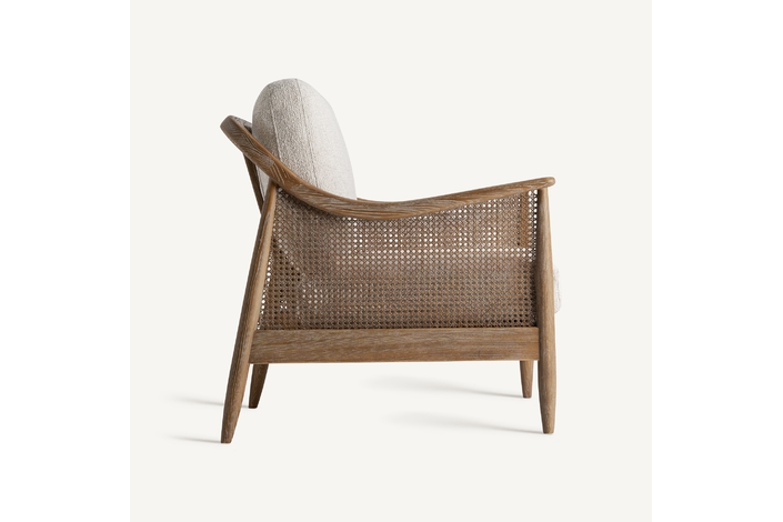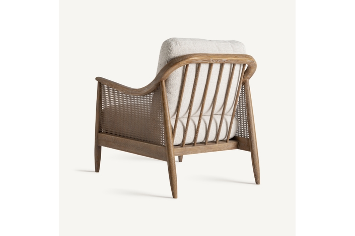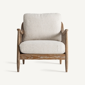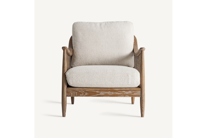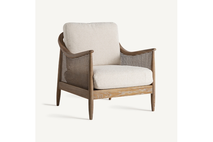 Sillón, fabricado en poliéster en color beige, combinado con madera de fresno en color marrón y espuma.