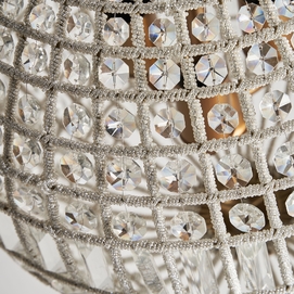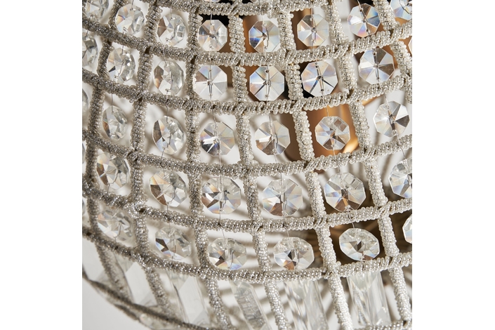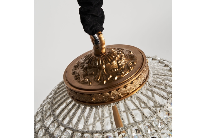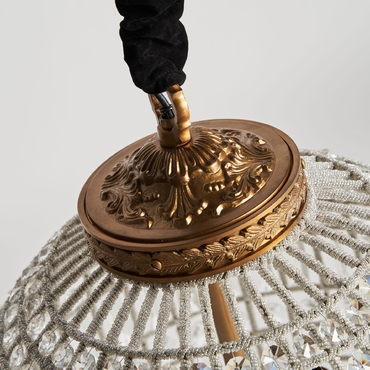 Lámpara de colgar, en color transparente, de estilo art deco. Fabricado en latón, combinado con cristal y aluminio.