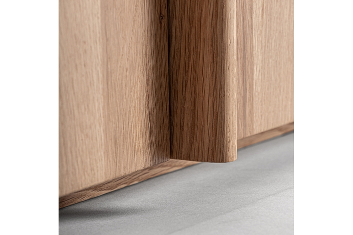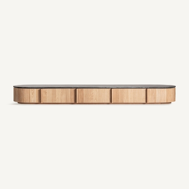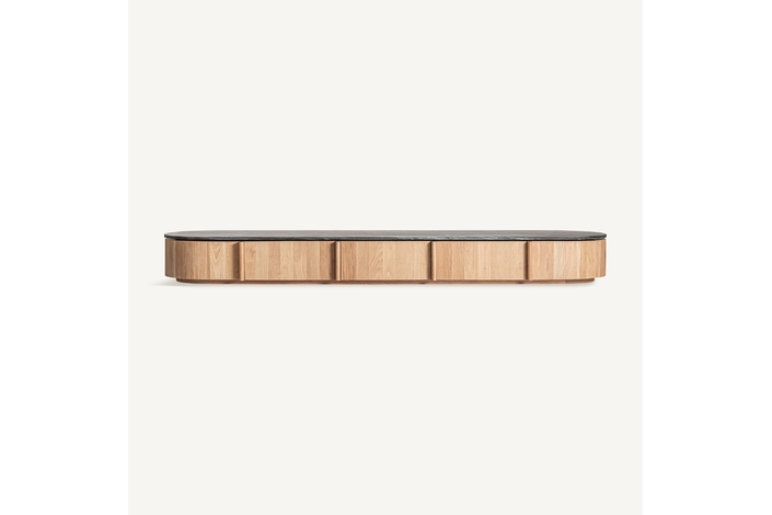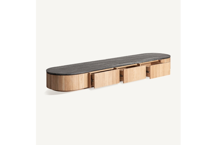 Mueble tv Nara de estilo contemporáneo, fabricado en madera roble en color marrón claro, combinado con mármol en color negro.
