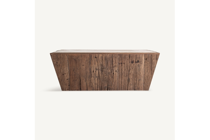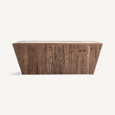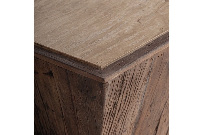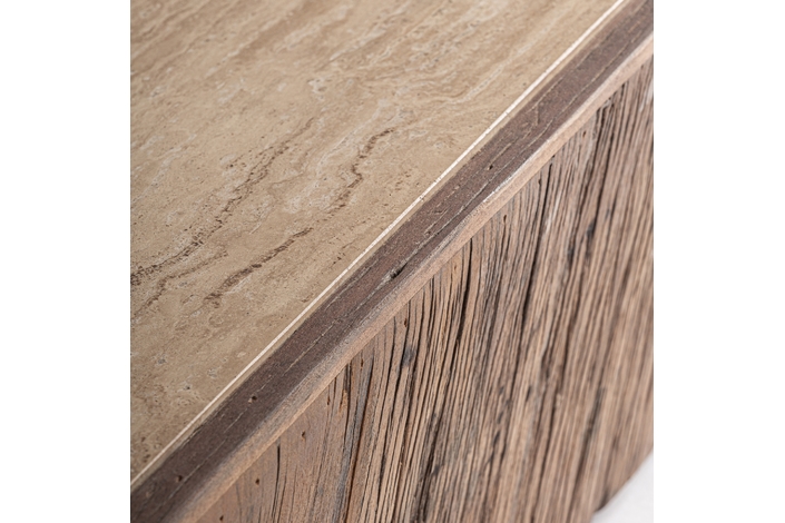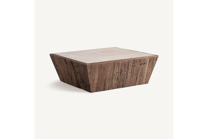 Mesa de centro, fabricado en madera recuperada en color marrón, combinado con travertino en color beige.