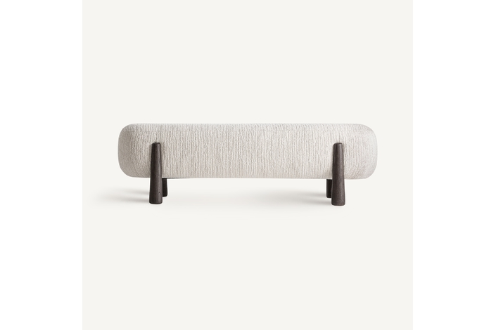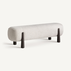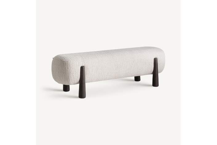 Reposapiés, fabricado en poliéster en color gris con acabado chenilla, combinado con madera de pino en color negro y espuma.