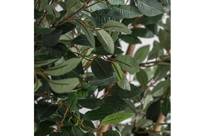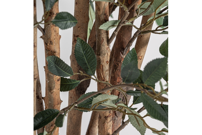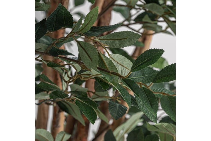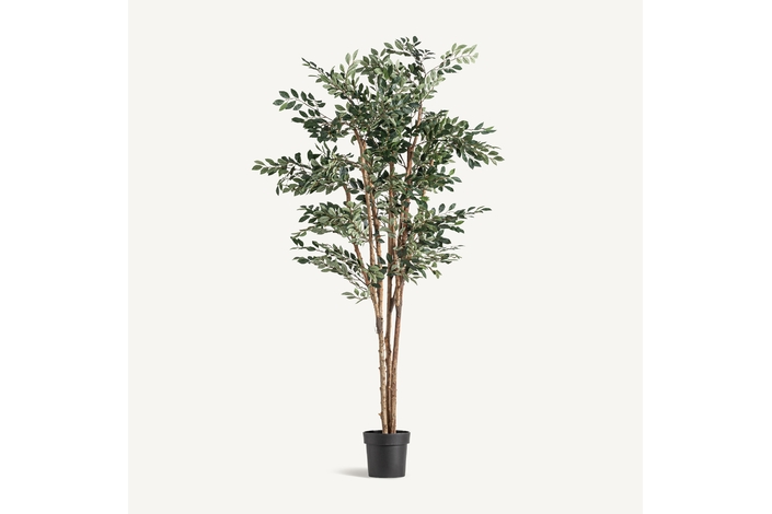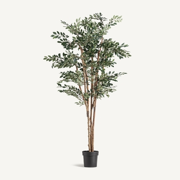 Planta Ficus de estilo contemporáneo, fabricado en poliéster en color verde, combinado con polietileno en color marrón y madera en color marrón. Producto plegable.
