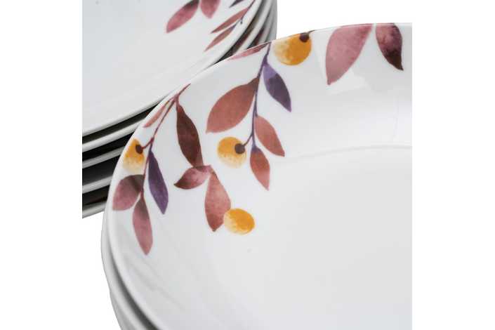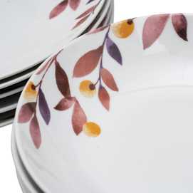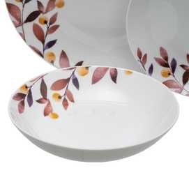 Material: porcelana. 6 platos llanos, diám 27x3cm. 6 platos hondos, diám 21x4,5cm. 6 platos de postre, diám 21,5x2,5cm. Apto para lavavajillas y microondas. No apto para canal HORECA.