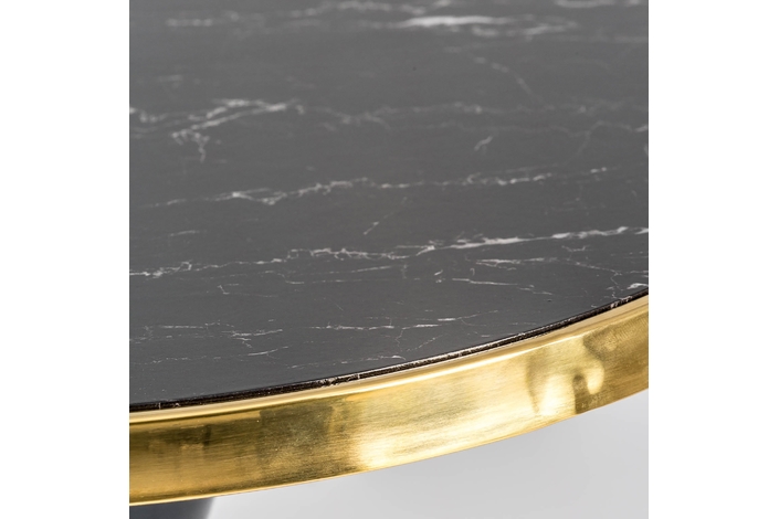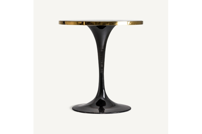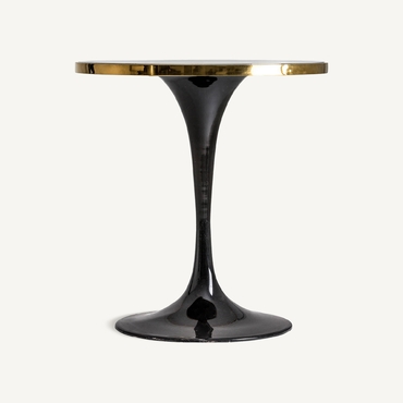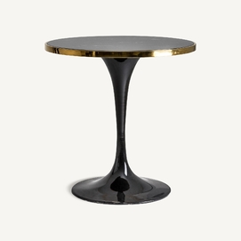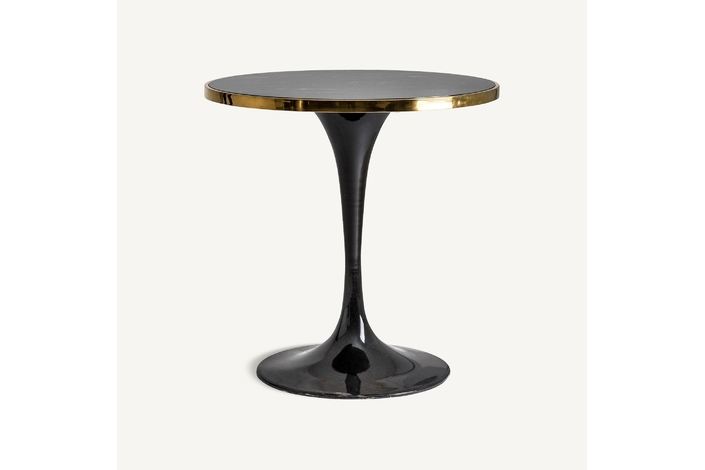 Mesa bar redonda than, en color negro, de estilo art deco. Fabricado en granito, combinado con hierro y acero. Granito con acabado mármol. Producto desmontable.