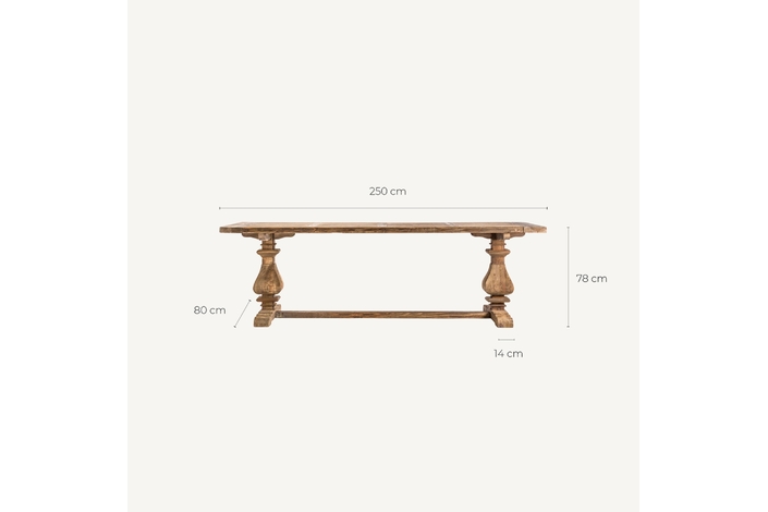 La Mesa de Comedor Abo de VICAL Home, con sus generosas dimensiones de 250x100x78cm, promete no pasar desapercibida. La mesa de comedor rústica está realizada en madera de pino reciclado. Su acabado natural destaca la riqueza de su material, mientras que su tamaño la convierte en el punto de encuentro favorito para grandes reuniones familiares y sociales.
