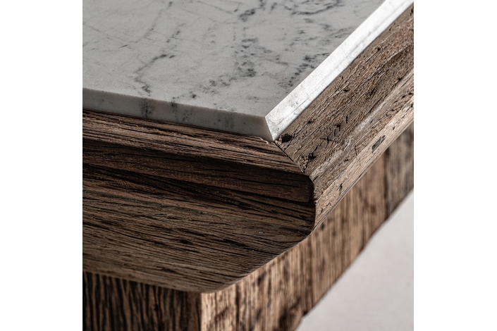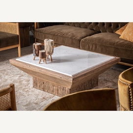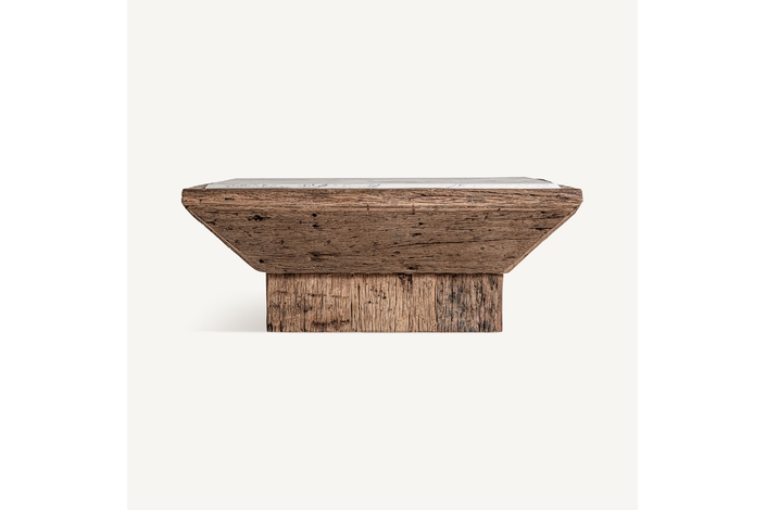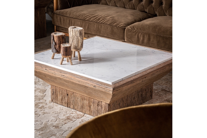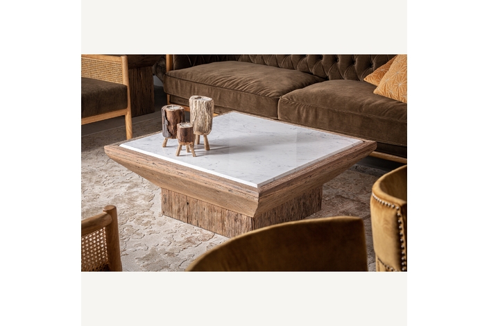 VICAL home presenta la Mesa de Centro Samsun, una declaración de sostenibilidad y estilo. Con un tamaño de 100x100x41cm, esta mesa de centro combina madera de pino reciclado envejecido con mármol, uniendo lo rústico y lo refinado. Cada pieza cuenta una historia diferente, haciendo de tu sala de estar un lugar con una belleza auténtica y vivida.
