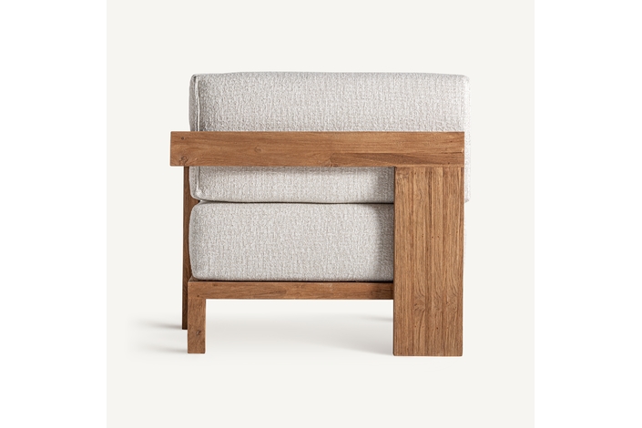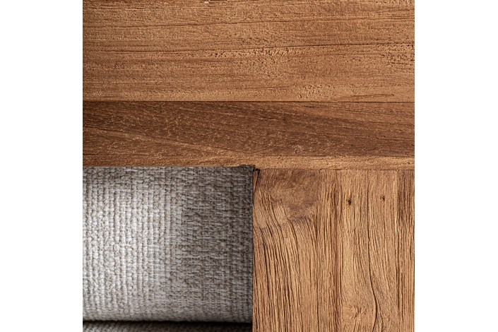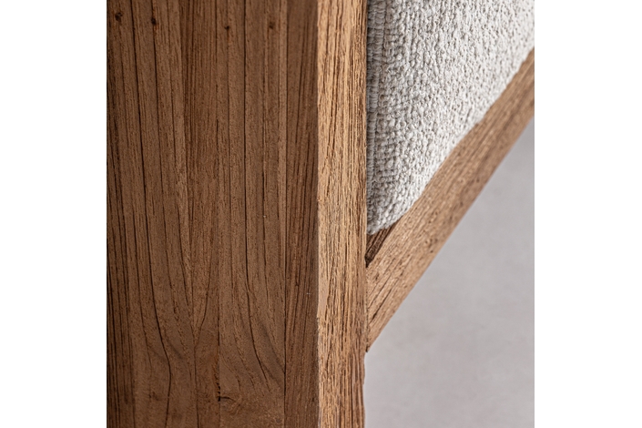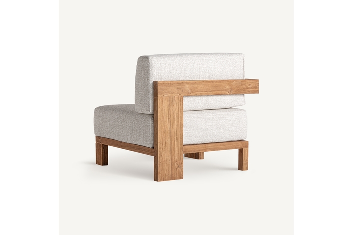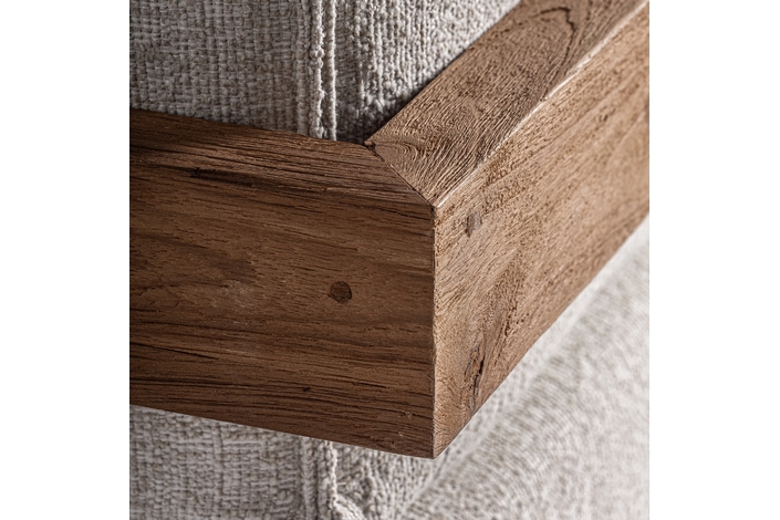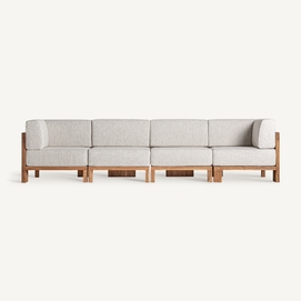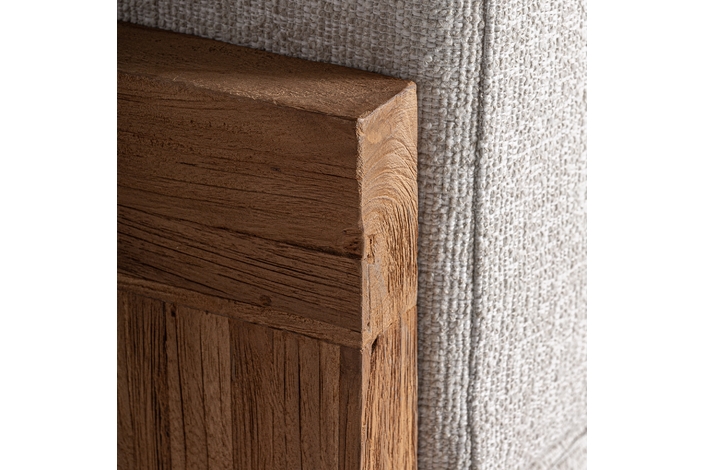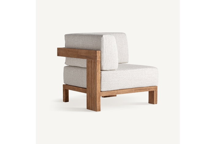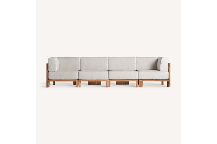 Sofá modular testa, en color marrón, de estilo colonial. Fabricado en madera de teka reciclada, combinado con polipropileno reciclado y espuma. Producto desmontable, desenfundable.