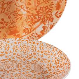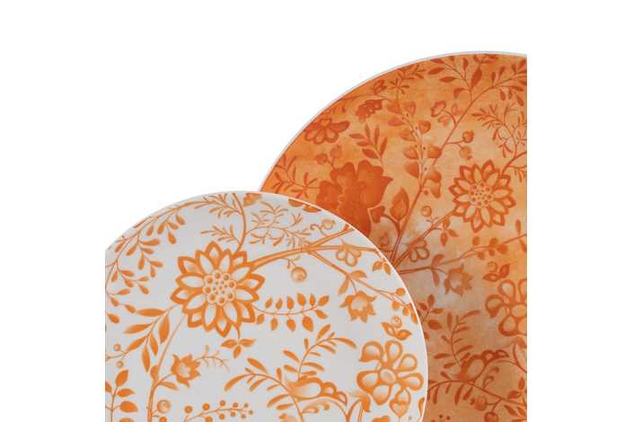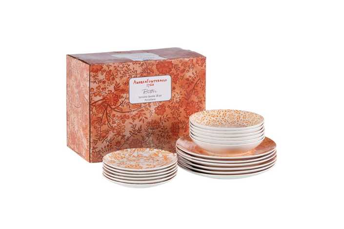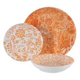 Material: porcelana. Incluye 6 platos llanos (diám.27cm*2,5cm), 6 platos hondos (diám. 22cm* 4,5cm) y 6 platos de postre (diám. 19cm*2cm). Apto para lavavajillas y microondas. No apto para canal HORECA.