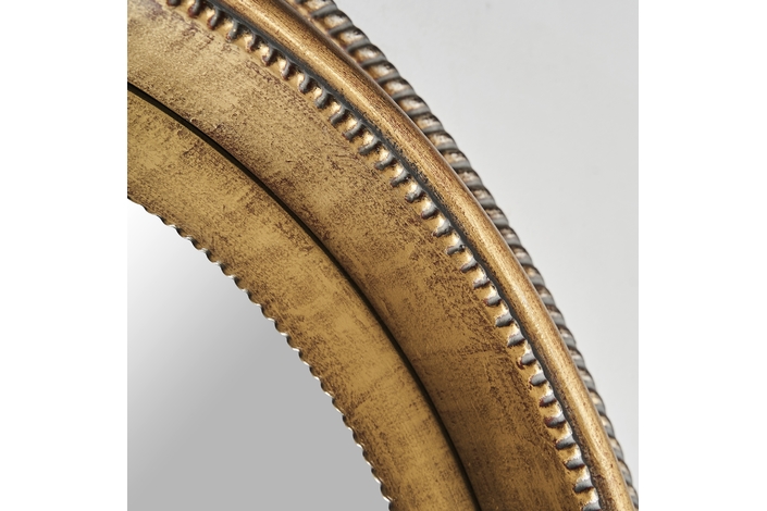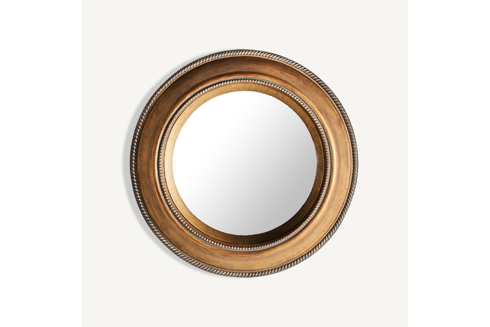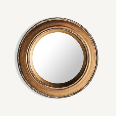 Espejo redondo almesso, en color oro viejo, de estilo art deco. Fabricado en espejo, combinado con resina.