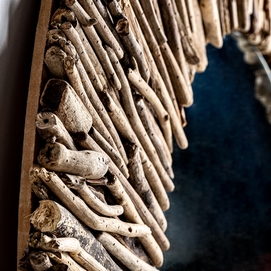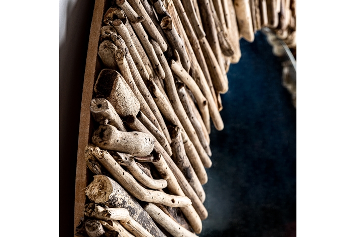 Espejo redondo varverg, en color marrón envejecido, de estilo étnico. Fabricado en madera tropical, combinado con espejo. Bastones madera.