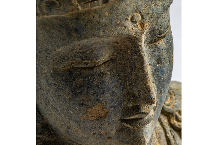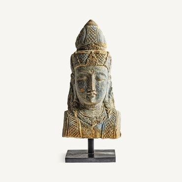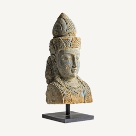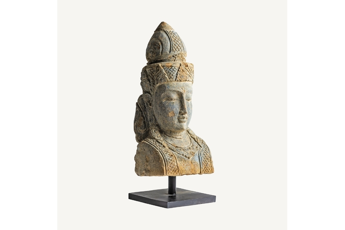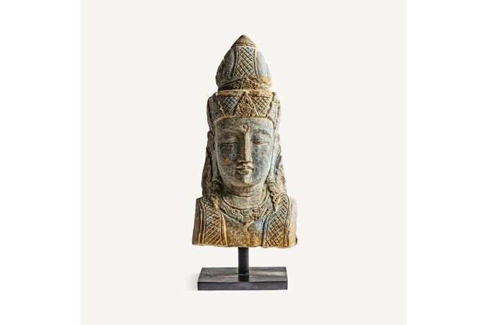 Busto budha, en color marrón, de estilo oriental. Fabricado en piedra.