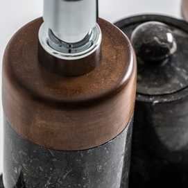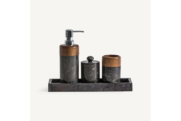 Una colección que te cautivará por la belleza del material de la piedra ónix y madera de ébano. Se trata de un juego de 4 piezas que se compone de: 3 accesorios y una bandeja que los recoge.