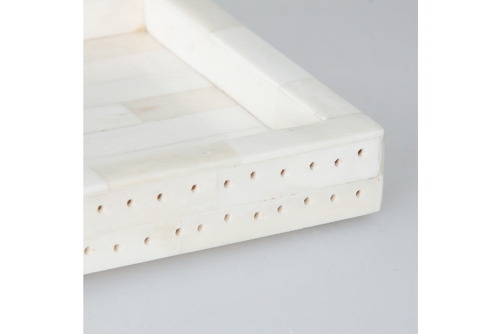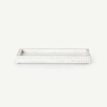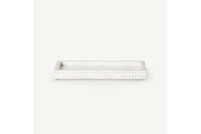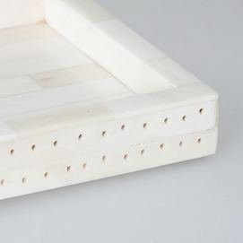 Una fina bandeja decorativa que se adapta con acierto a cualquier estilo decorativo donde reine la elegancia de lo sencillo. Elaborada en resina y hueso con un acabado blanco pulido.