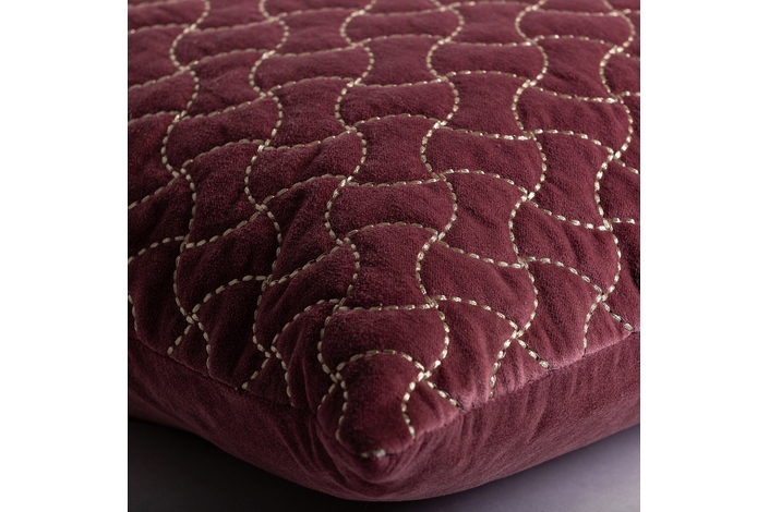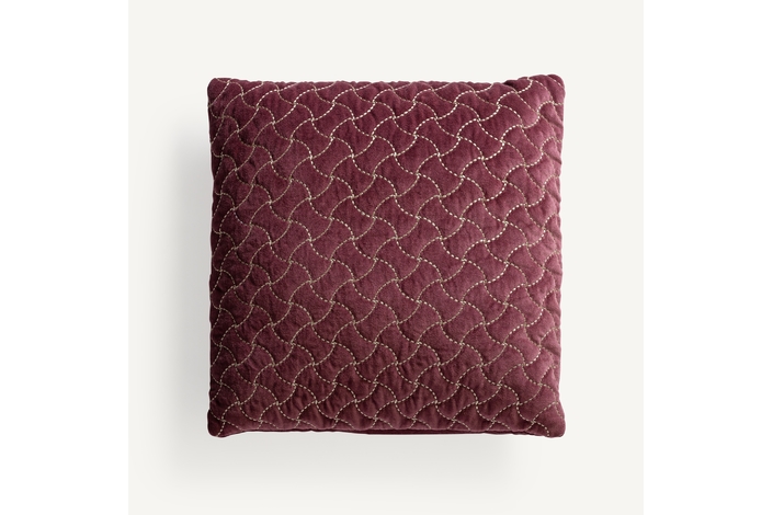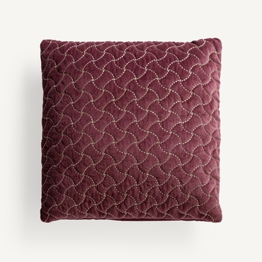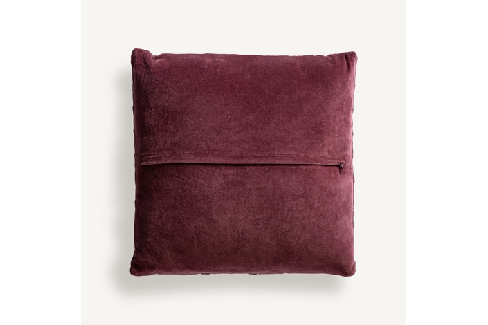 Cojín lis, en color burdeos bordado, de estilo clásico. Fabricado en terciopelo, combinado con algodón y poliéster. Producto desenfundable.