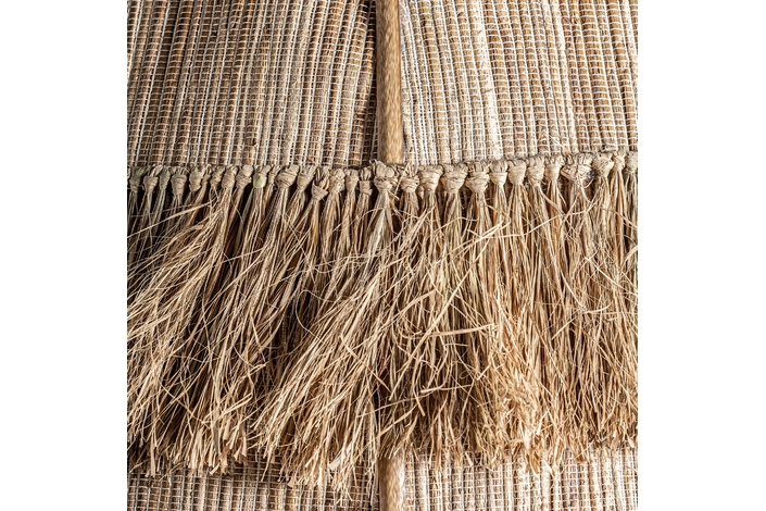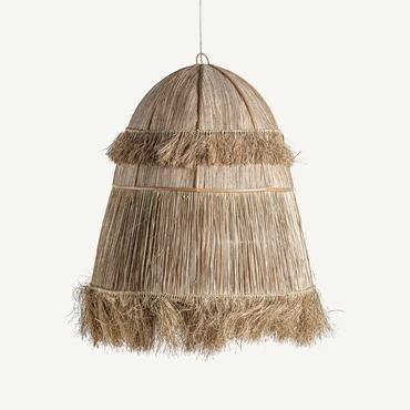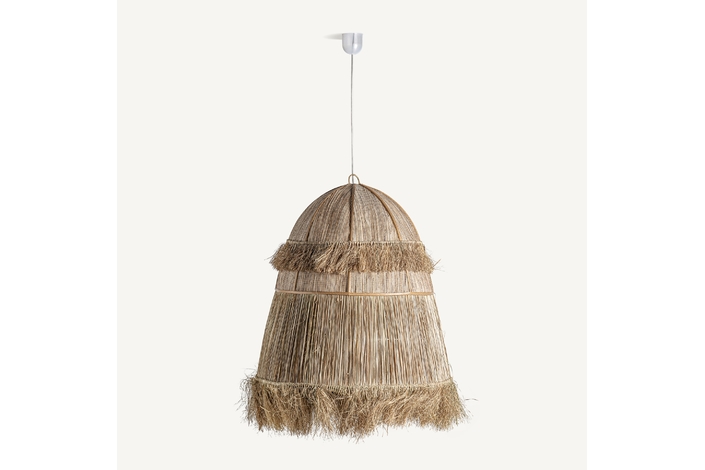 Lámpara de colgar, en color marrón, de estilo boho. Fabricado en madera de coco, combinado con fibra natural.