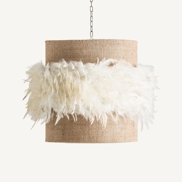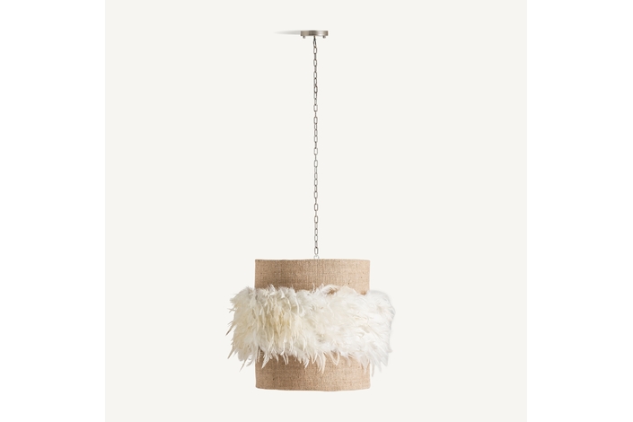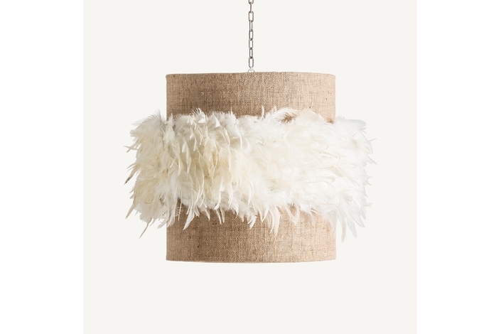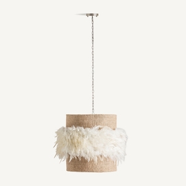 Lámpara de colgar, en color marrón, de estilo étnico. Fabricado en plumas, combinado con yute.