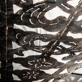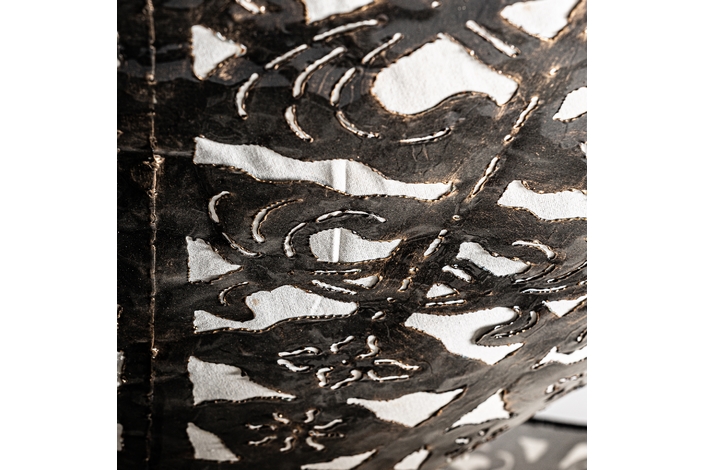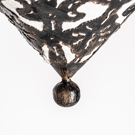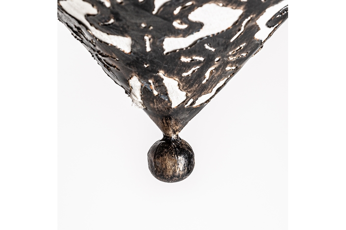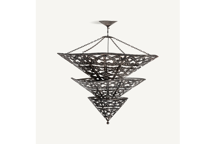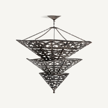 Lámpara de colgar triangular, en color negra, de estilo oriental. Fabricado en latón, combinado con loneta y hierro.