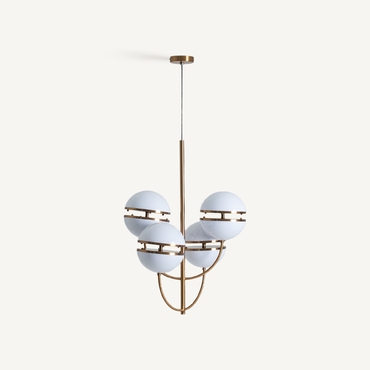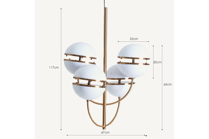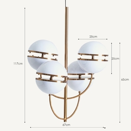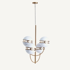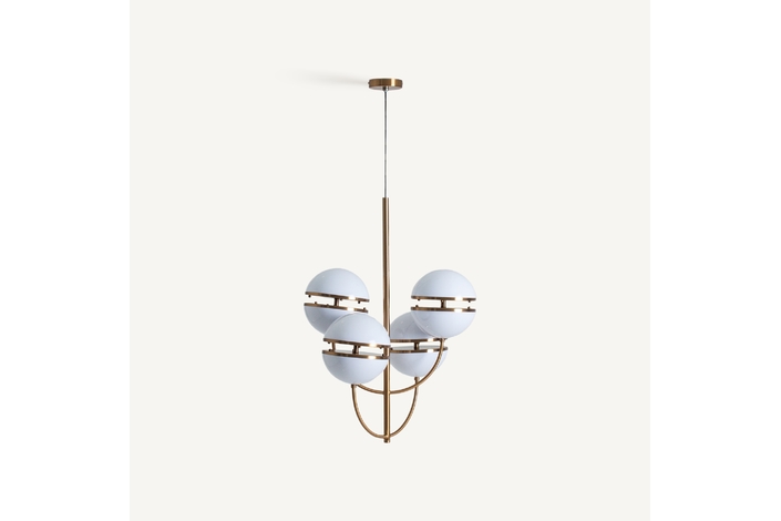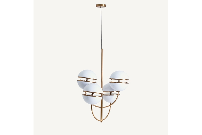 Lámpara de colgar, en color blanco/oro, de estilo art deco. Fabricado en hierro, combinado con cristal. Producto desmontable.