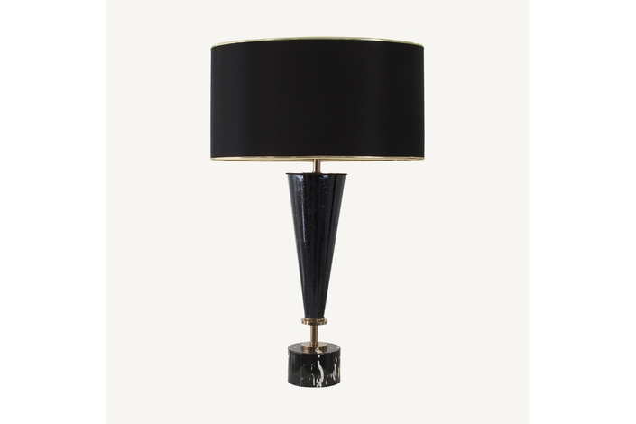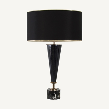 Lámpara de sobremesa, en color negra, de estilo clásico. Fabricado en hierro, combinado con vidrio y lino.