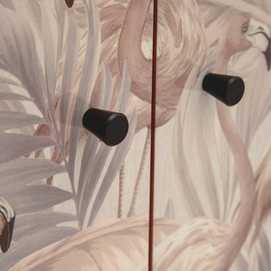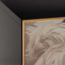 Material: estructura principal madera de abeto - resto Dm. Altura patas: 15.5cm. Dividido en su mitad. Medida huecos: 55x61.5cm.