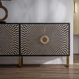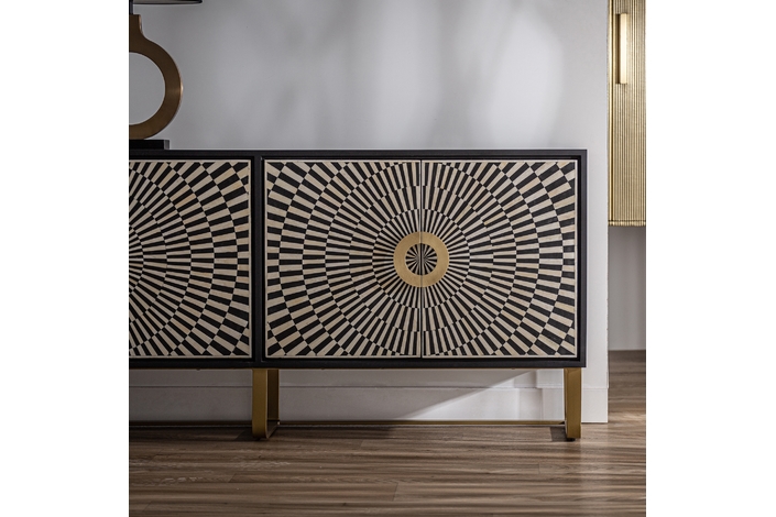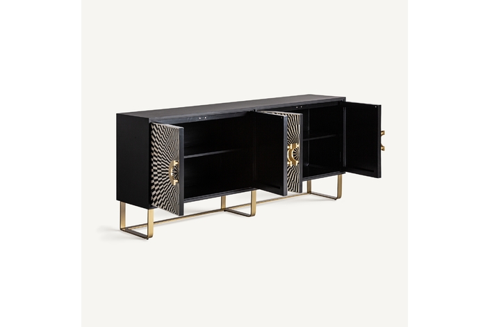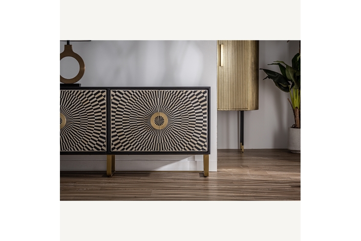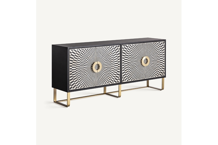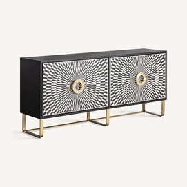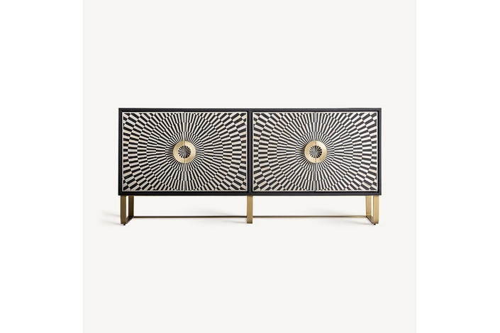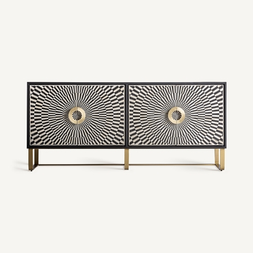 El Mueble TV Gatsby de VICAL home es la fusión perfecta entre diseño y practicidad. Realizado en hierro y acentuado con detalles en hueso, su acabado en negro, blanco y oro lo convierte en una pieza central de cualquier sala de estar. Sirviendo tanto como buffet como mueble de TV, es ideal para aquellos que buscan versatilidad sin comprometer la estética. Con espacio suficiente para almacenar y exhibir, este mueble es el complemento perfecto para entornos modernos y sofisticados.