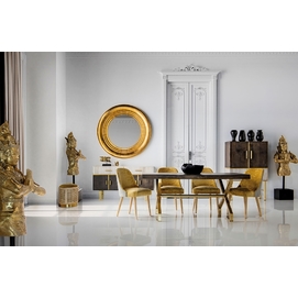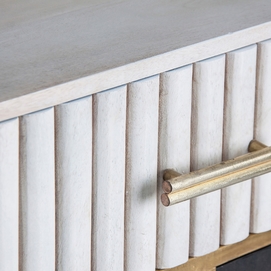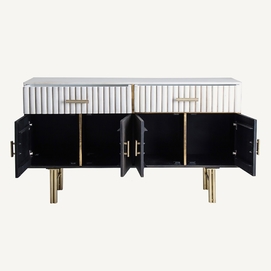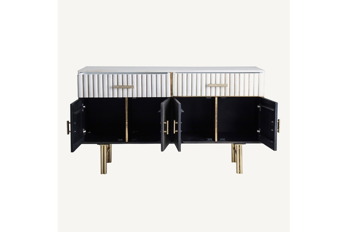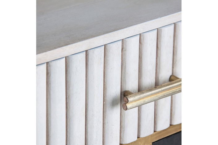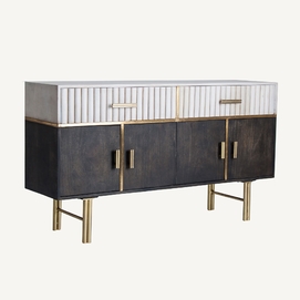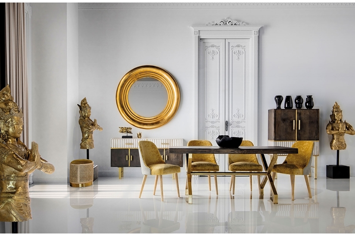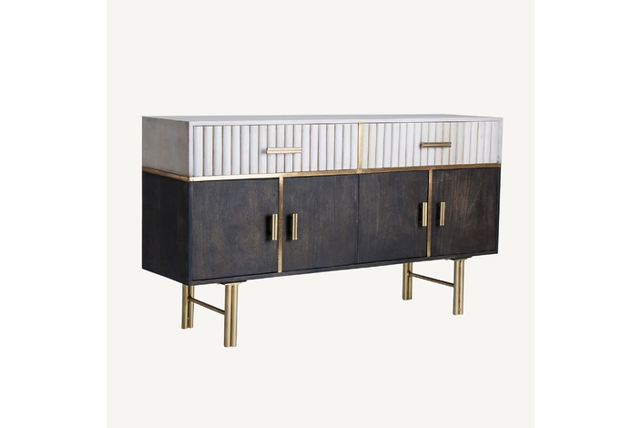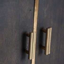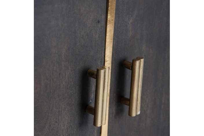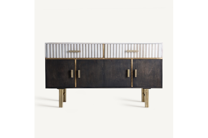La madera de mango, cálida y expresiva, se une al hierro y latón en el Aparador Glees de VICAL. Su acabado marrón y dorado evoca el lujo discreto del art déco, mientras que su carácter desmontable lo convierte en una pieza versátil y envolvente.