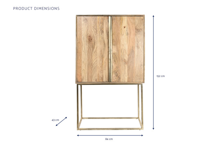 Dimensiones (cm) Longitud 84  |  Fondo 43  |  Altura 152 Peso neto producto (kg) 40,00 Material Mango  |  Metal