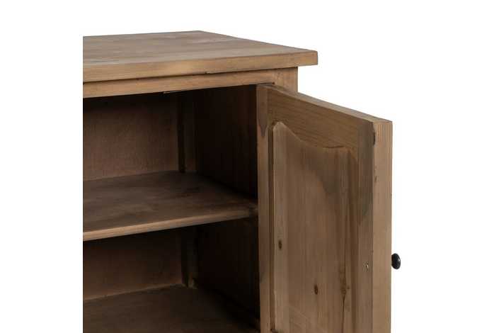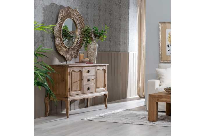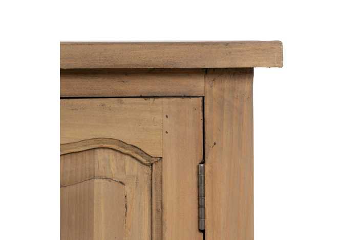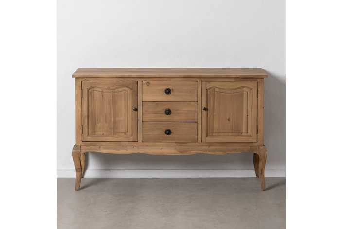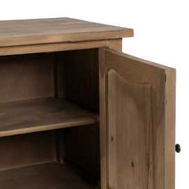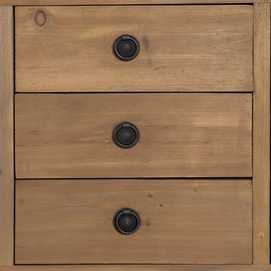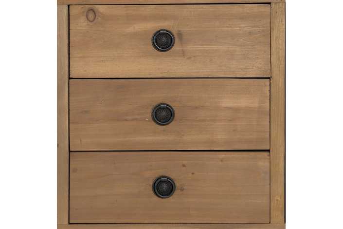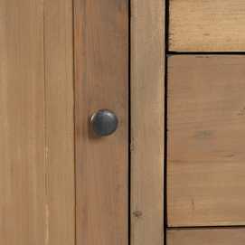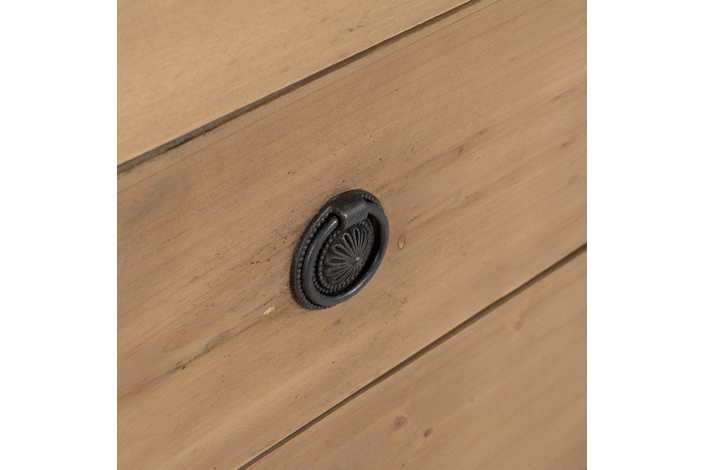 Material: madera reciclada de pino. Puertas: 44,5x49cm. Cajones: 44x16,5cm. Altura patas: 29,5cm. Incluye leja interior.