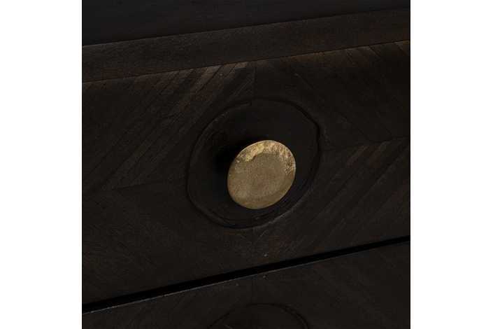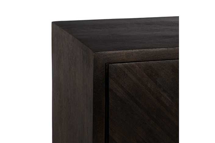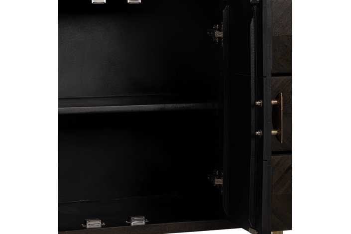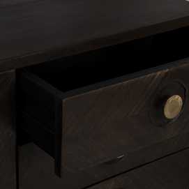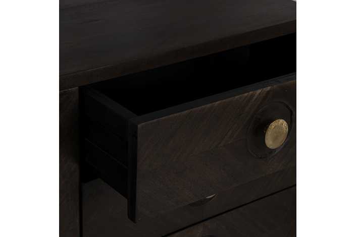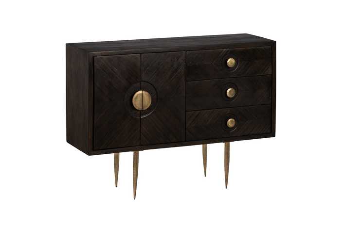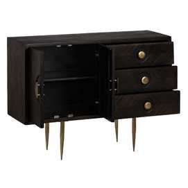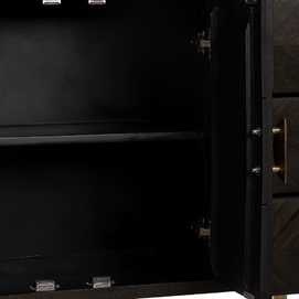 Material: madera de mango, hierro. Puertas: 29x55cm Cajones: 57,5x18,5cm. Altura patas: 30cm. Altura balda interior: 27cm.