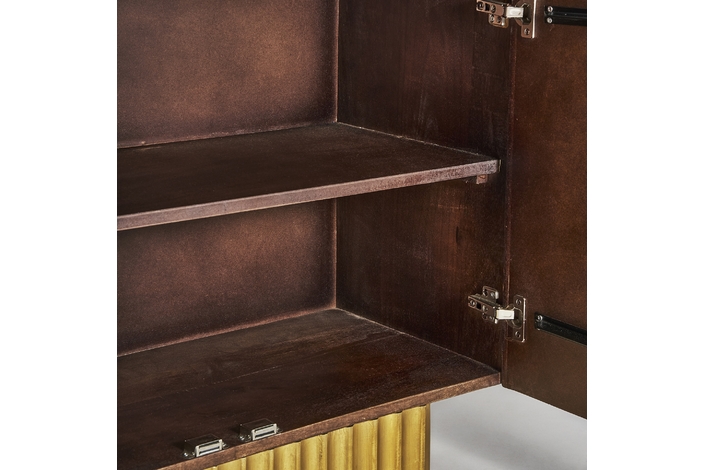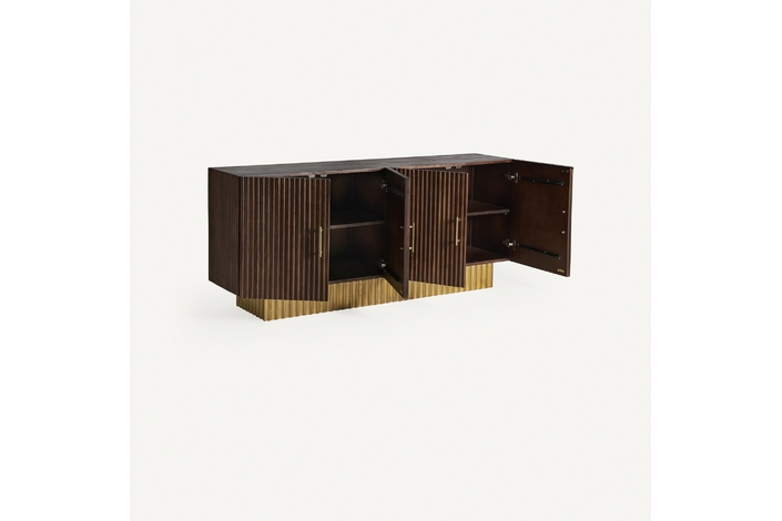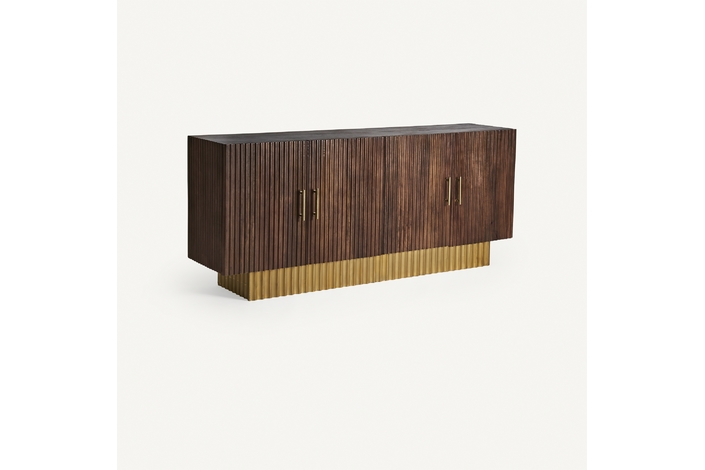 El Buffet Mesia de VICAL home es un testimonio de diseño refinado y artesanía superior. Realizado en madera de mango, su acabado marrón/oro da un toque de lujo a cualquier espacio.El buffet salón madera de mango es ideal para salones y comedores que desean combinar elegancia y modernidad. Su diseño robusto y detallado es una deliciosa mezcla de funcionalidad y estética. Proporcionando suficiente espacio de almacenamiento, este buffet es tanto una pieza artística como práctica.