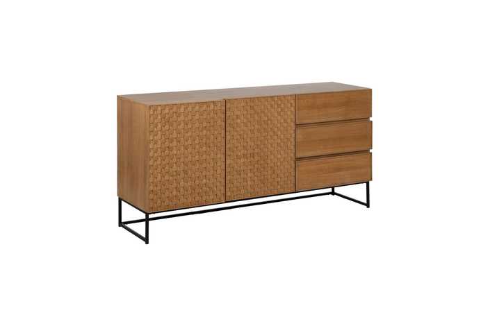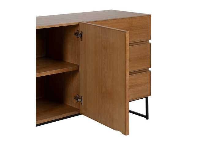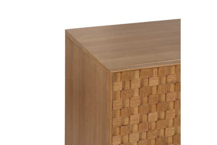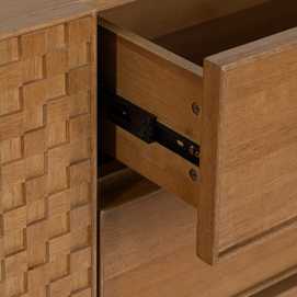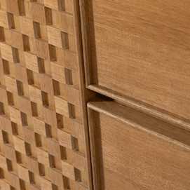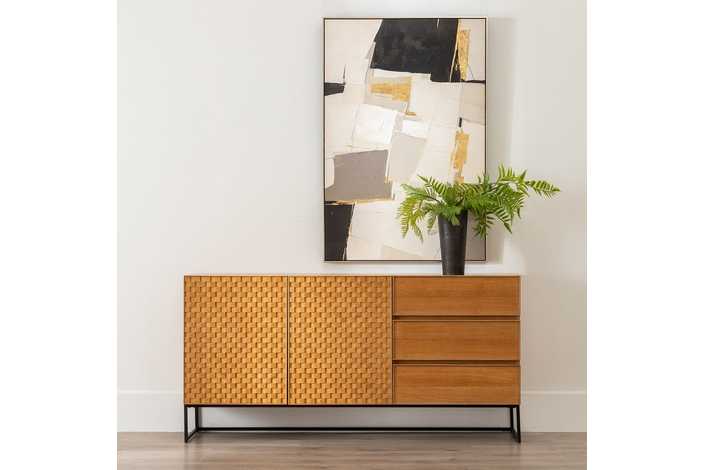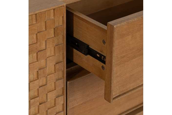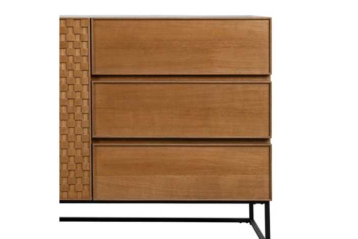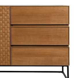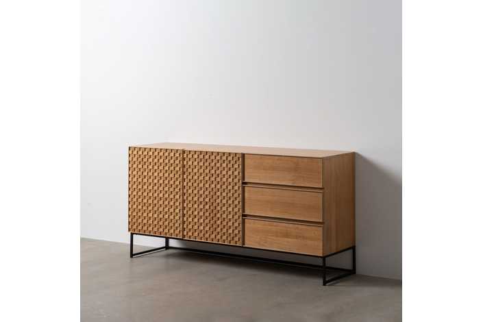 Material: Dm - metal (hierro) - vinilo madera de fresno. Medida puertas: 49x61cm. Medida cajones: 60.5x19cm. Altura pata: 18cm. Leja interior, altura huecos: 27.5cm. Patas para montar.