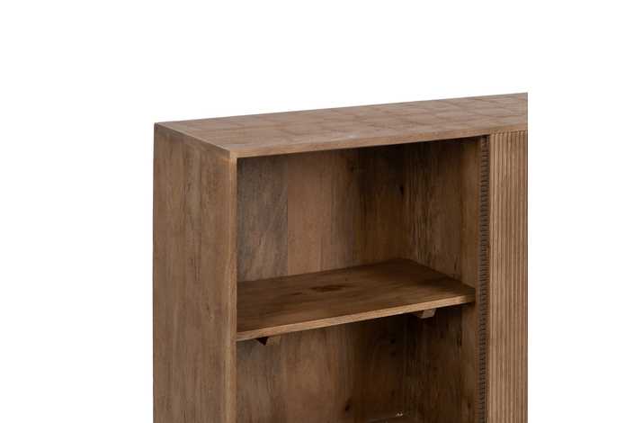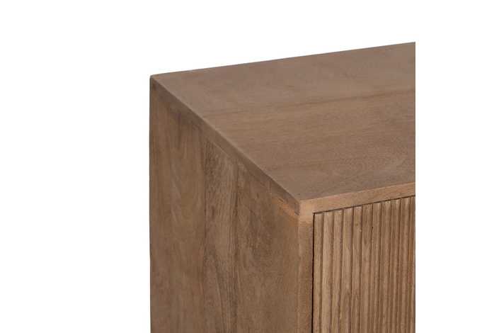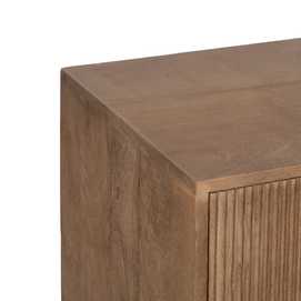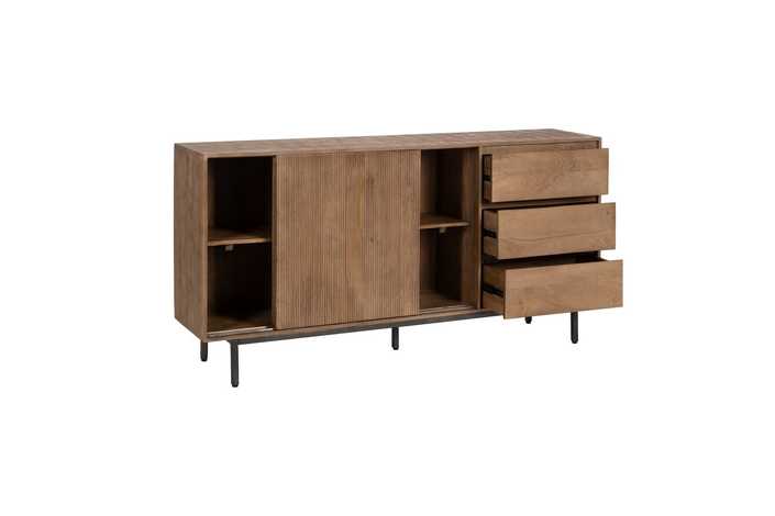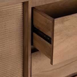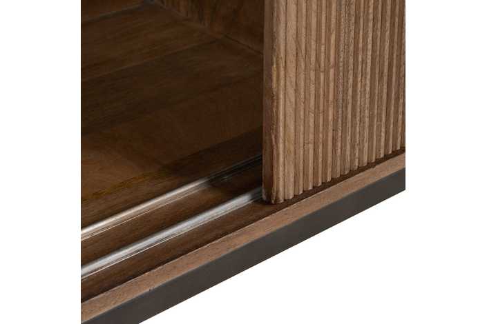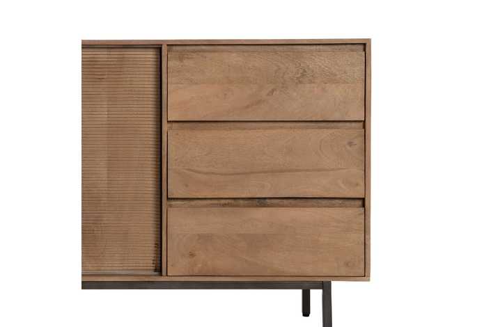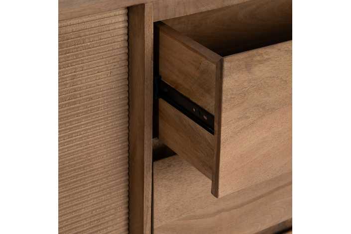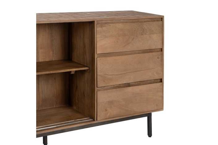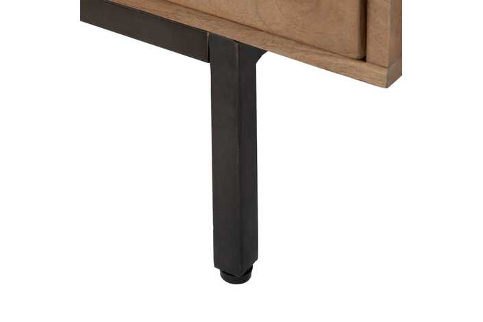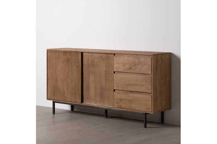 Material: madera de mango, hierro. 19cm. altura patas 2 puertas correderas 3 cajones medidas: 52x30cm.