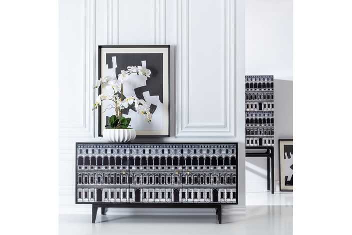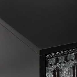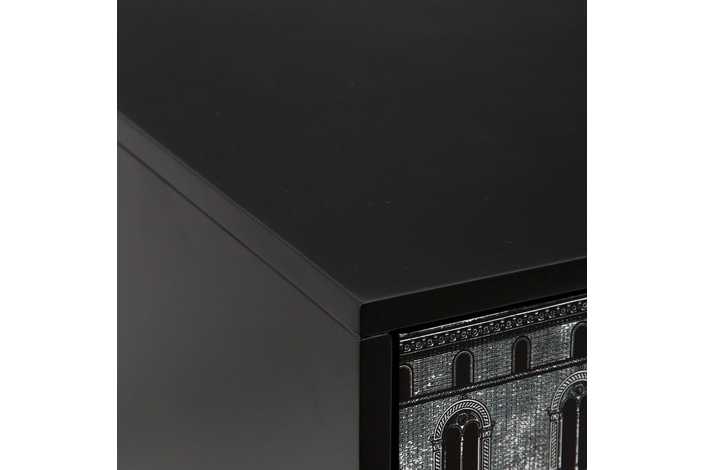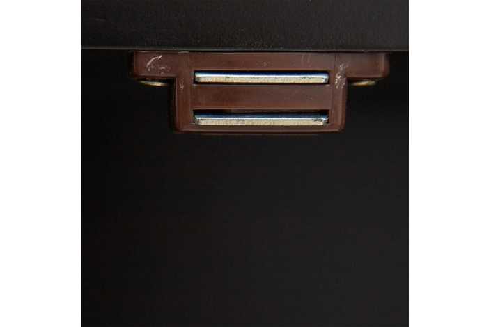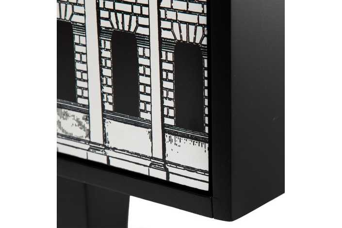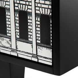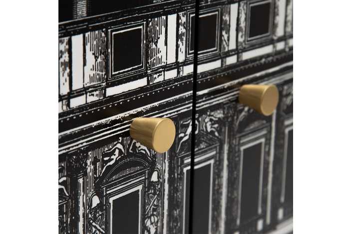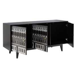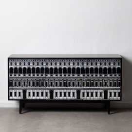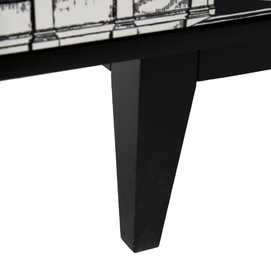 Material: estructura principal madera de abeto - resto Dm. Altura patas: 18cm. Dividido en tres huecos que coinciden con las puertas. Medida huecos: 46x54cm.