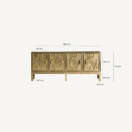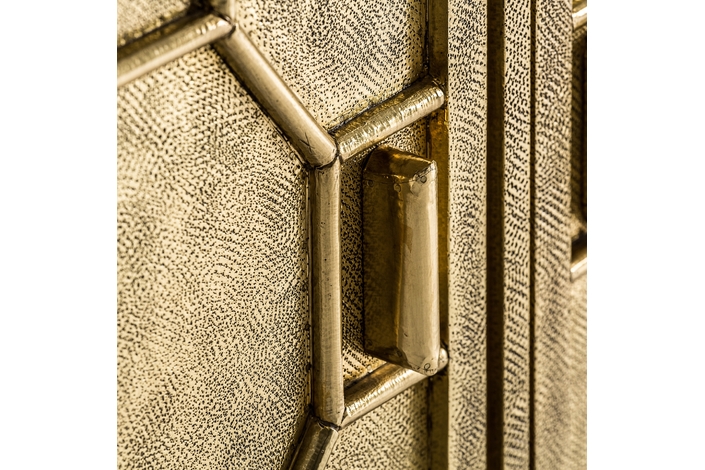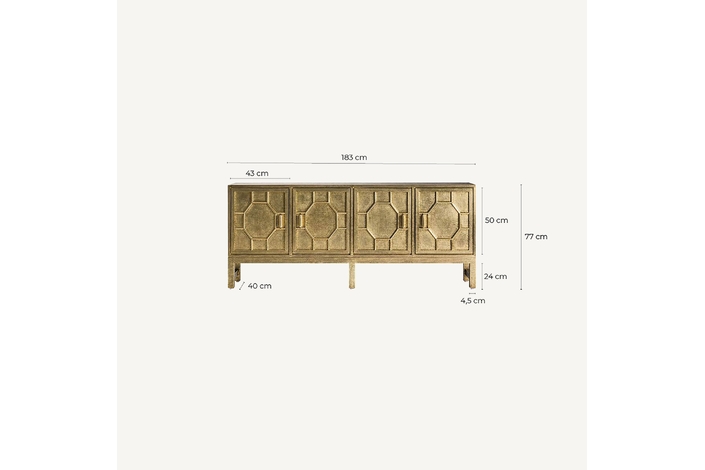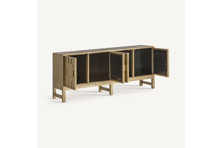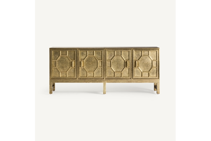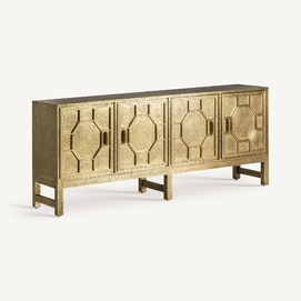 Transforma tu espacio con el exquisito Buffet Recke de VICAL home. Confeccionado en latón repujado y madera DM, este mueble aporta lujo y distinción. Su acabado en oro viejo complementa a la perfección su diseño detallado, haciendo de este buffet de latón repujado el protagonista de cualquier habitación. Perfecto para salones y comedores que buscan una pieza que combine funcionalidad con un diseño imponente. Una inversión en estilo y durabilidad.