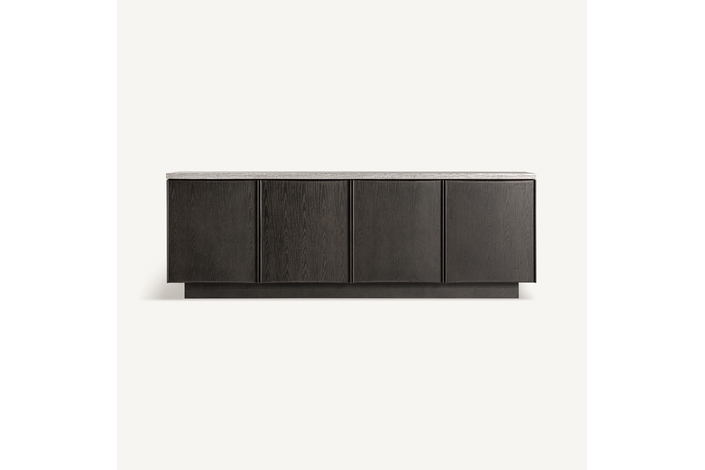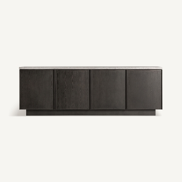 Aparador Rignac de estilo contemporáneo, fabricado en travertino en color gris, combinado con madera de fresno en color marrón.