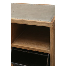 Tablero en pino y metal galvanizado / Pine and galvanized metal top / Tableau en pin and métal galvanisé. Cajones de pino / Tiroirs en pin / Pine drawers : 19x40x18 cm Cajones en metal / Tiroirs en métal / Metal drawers: 31x48x19 cm. Nuestra madera rúsMedidas: 148,5x51,5x61h cm
