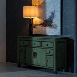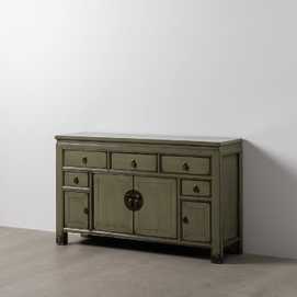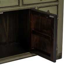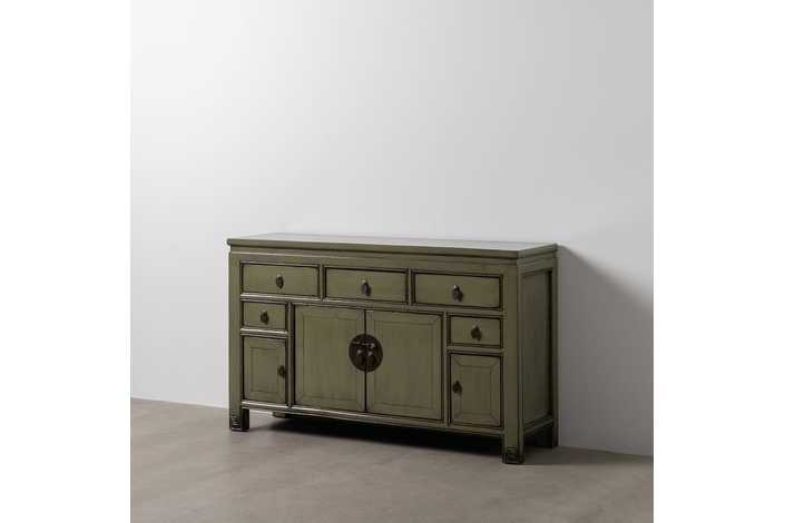 Estructura de madera de pino reciclada. Material cajones: madera de pino y DM. Material tiradores: Cobre. Medidas de las puertas grandes: 35x42,5cm. Medidas puertas pequeñas: 22x27,5cm. Medidas 3 cajones grandes:38,5x12cm. Medidas 2 cajones pequeños:22,5x11cm. Altura patas: 10 cm. Peso soportado: 100kgs.