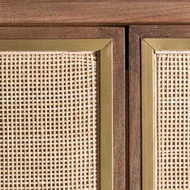 Armario gondorf, en color marrón/oro, de estilo nórdico. Fabricado en madera de mango, combinado con latón y ratán. Producto desmontable.