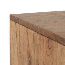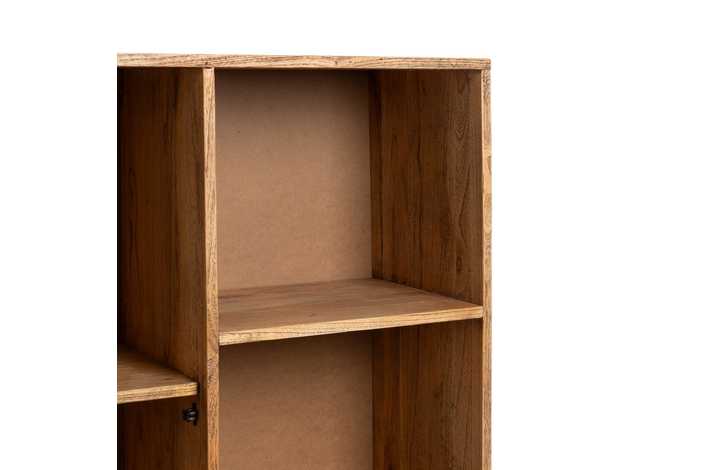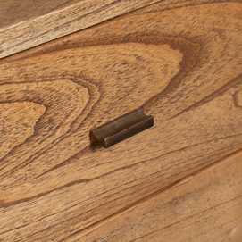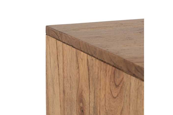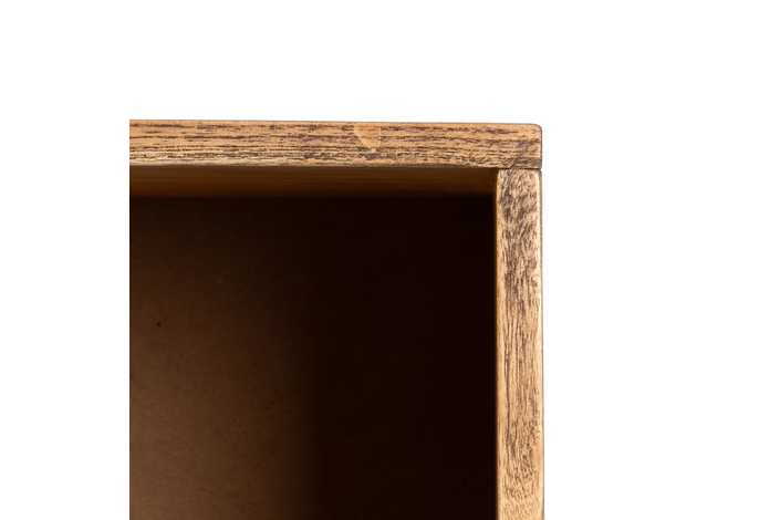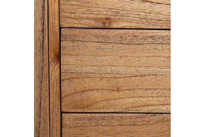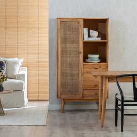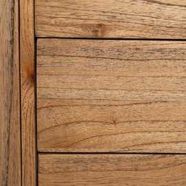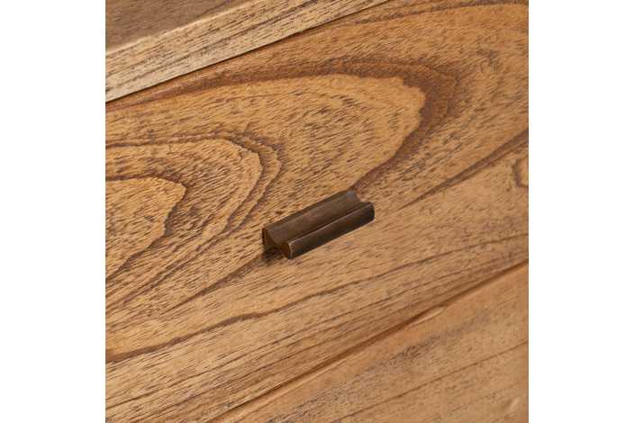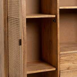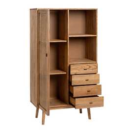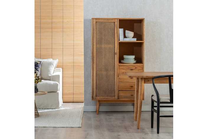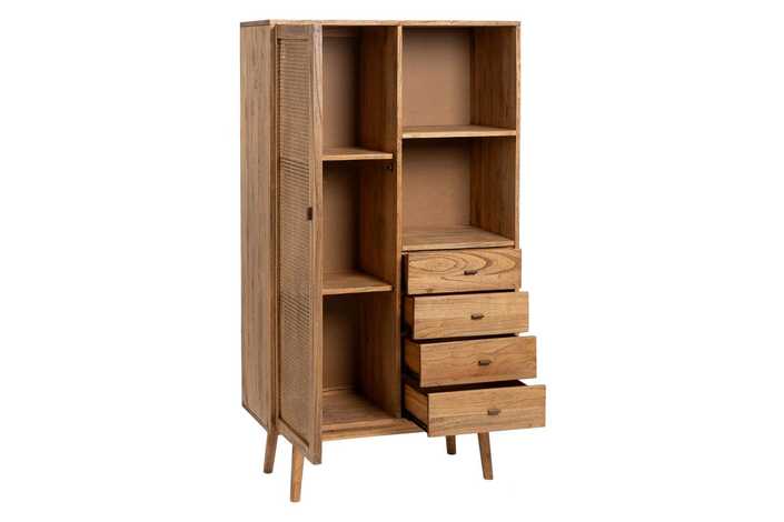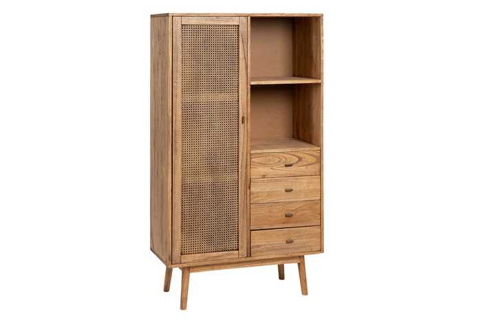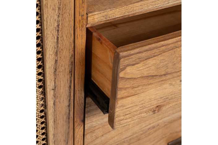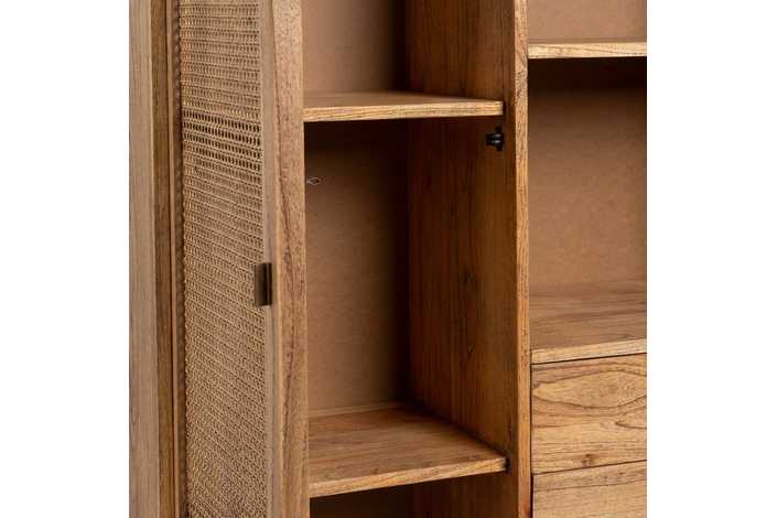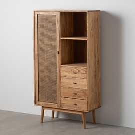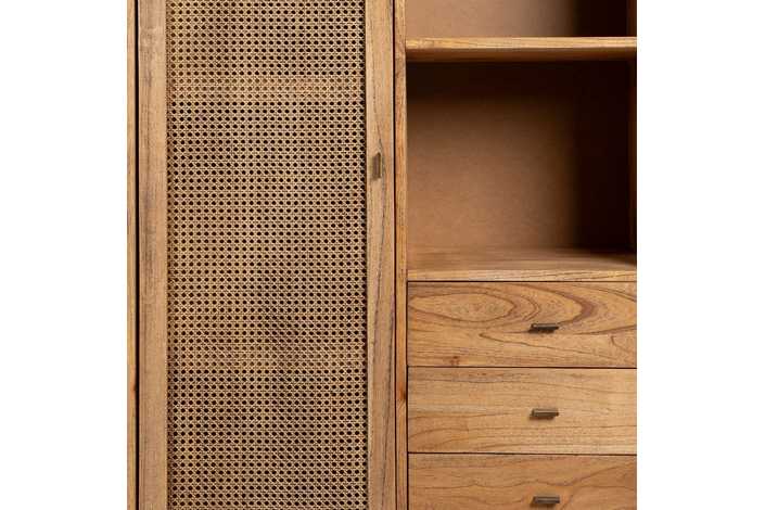 Material: madera de mindi, fibra natural. Puerta: 42x136cm. Cajones: 42x14,5cm. Huecos: 42x37cm. Altura patas: 19,5cm. Patas para montar.