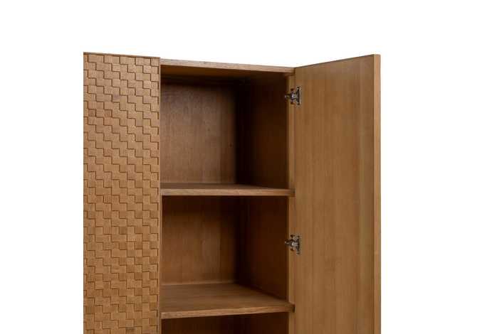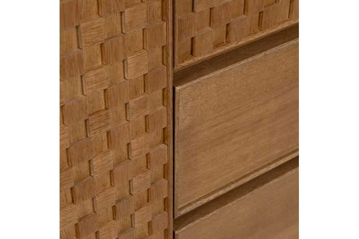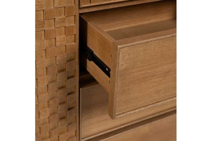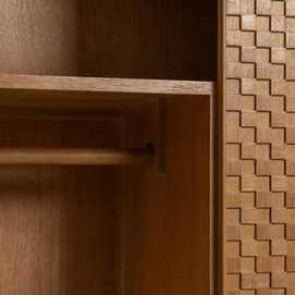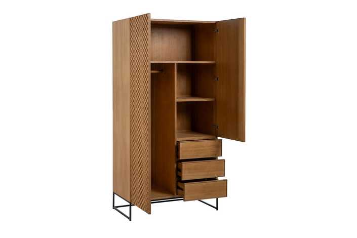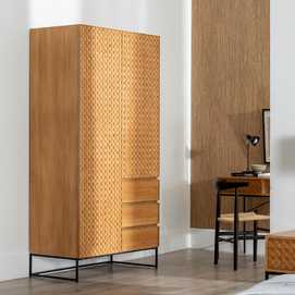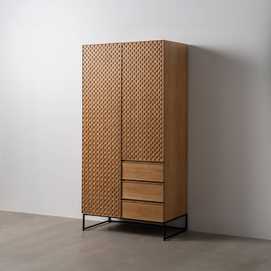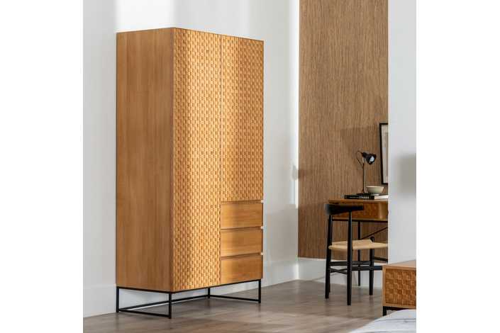 Material: Dm - metal (hierro) - vinilo madera de fresno. Medida puertas: 49x181 - 49x121cm. Altura pata: 18.5cm. Medida cajones: 49x18cm. Altura leja superior: 40cm. Barra interior. Patas para montar.